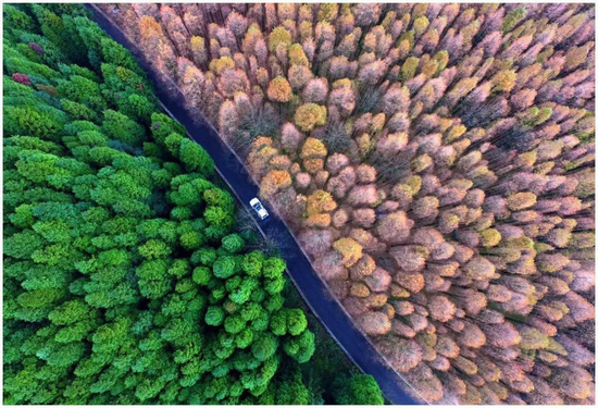 一条狭长绵延的公路,将森林鲜明地分隔为两种色系,黄与绿的碰撞相得益彰,“泾渭分明”的视觉震撼美得堪称惊艳,斑斓绚丽的秋色足以让人魂绕梦牵!
