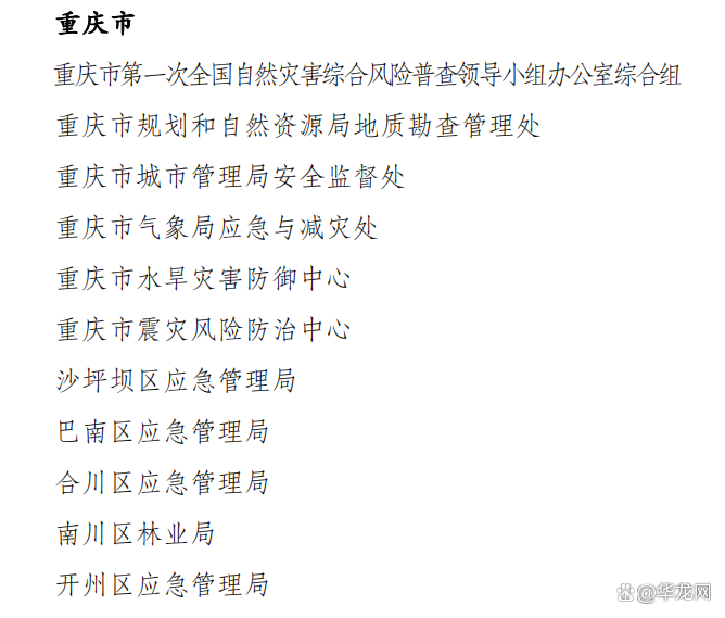 2020年以来,重庆市按照“1+9+21+41”(市普查办+9个市级牵头行业部门+21个市级配合行业部门+41个区县)架构建立重庆风险普查工作体系。